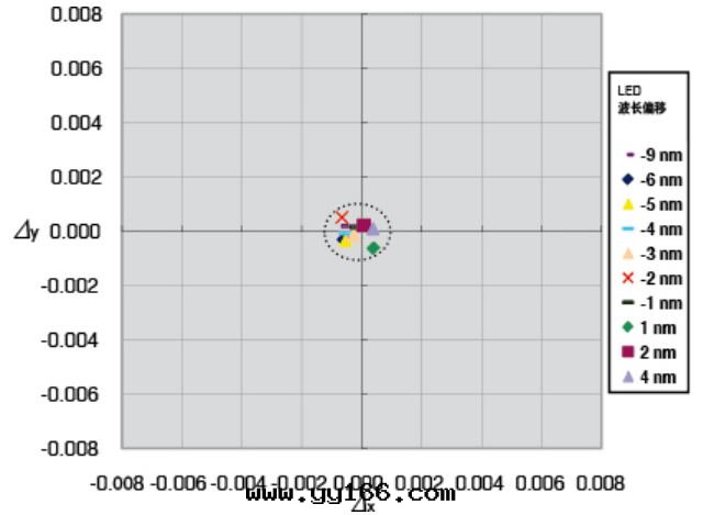 即使同(tóng)一(yī)批次(cì)的(de)LED背光(guāng)的(de)發(fà)光(guāng)輻射曲線(xiàn),也(yě)会(huì)經(jīng)常有(yǒu)所(suǒ)不(bù)同(tóng),在(zài)其(qí)波(bō)峰(fēng)處(chù)約有(yǒu)10nm左(zuǒ)右的(de)偏移現(xiàn)象(xiàng)。如(rú)果(guǒ)使用(yòng)傳統的(de)色(sè)彩分(fēn)析仪来(lái)測量(liàng)調整这(zhè)種(zhǒng)特(tè)性(xìng)屏幕的(de)白(bái)平衡,在(zài)xy色(sè)度(dù)上(shàng)引起(qǐ)的(de)誤差可(kě)能要接近0.010左(zuǒ)右。但如(rú)果(guǒ)使用(yòng)CA-310,同(tóng)樣(yàng)条(tiáo)件(jiàn)下(xià)的(de)色(sè)度(dù)誤差会(huì)減小到(dào)0.003左(zuǒ)右,約为原来(lái)的(de)1/3,大(dà)大(dà)提(tí)高(gāo)了測量(liàng)精度(dù)和(hé)穩定(dìng)性(xìng)。